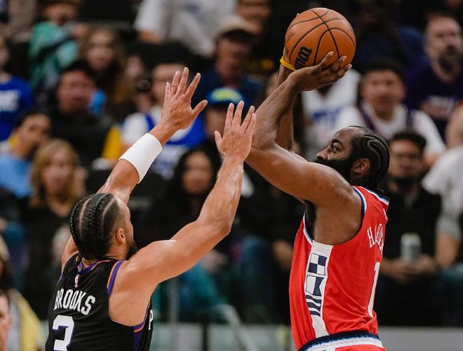 太阳开局以来4胜5负,整体表现比预期要好,特别是阿伦+奥尼尔+邓恩+马威四位角色球员,发挥都比较稳定。上一场和快船的较量,杰伦格林迎来太阳生涯首秀,23分钟轰下29分,三分组织防守表现都很全面。布克也直言,看到了杰伦格林的潜力,他有非常高的天赋。值得一提的是,布克在赛季前八场场均砍下31分,也刷新了由自己保持的此前场均29.6分的队史纪录。赛前,快船随队记者确认,哈登因生病,降级为出战成疑(50%概率)。但泰伦卢公布的首发阵容,还是哈登,而且本场比赛快船再度变阵,把邓恩拿上去,搭档比尔和哈登。